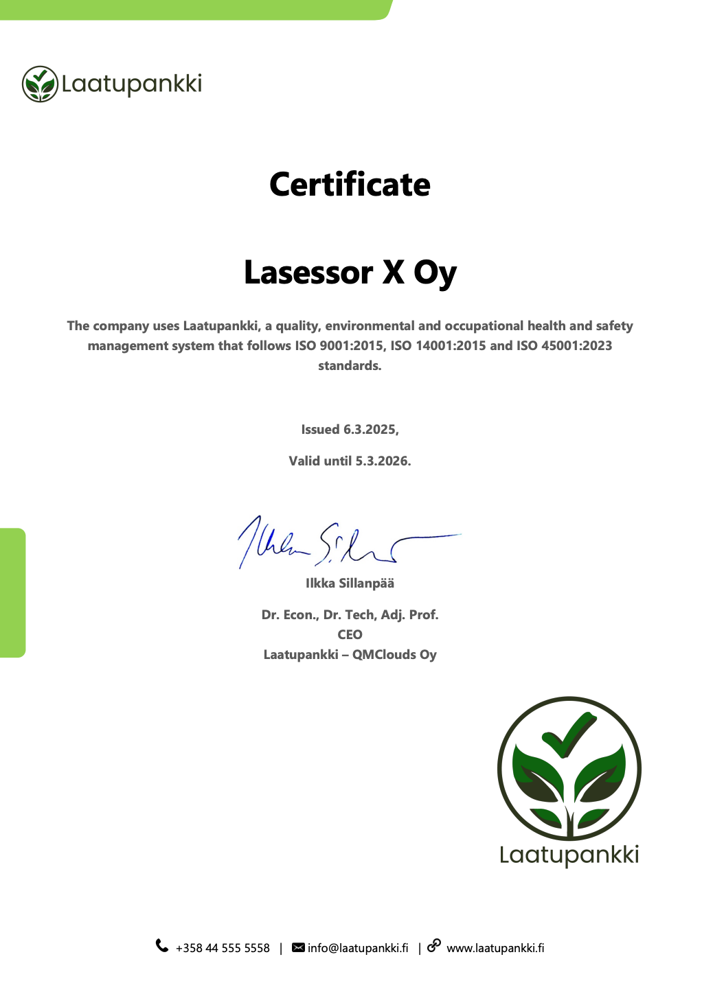 Yrityksemme toiminta on auditoitu ja sertifioitu Laatupankin toimesta seuraavilla standardeilla: